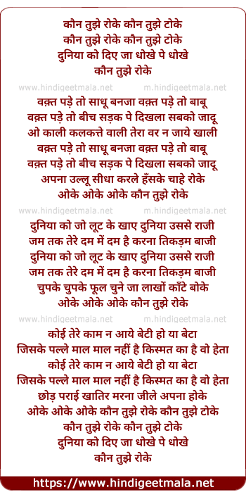 Lyrics of Kaun Tujhe Roke Kaun Tujhe Toke - कौन तुझे रोके कौन तुझे टोके