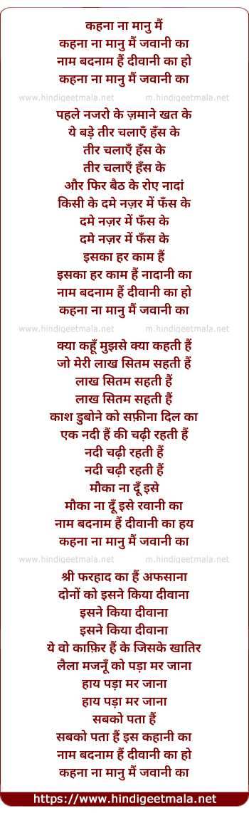 Lyrics of Kehna Naa Mano Main Jawani Ka - कहना ना मानू मैं जवानी का