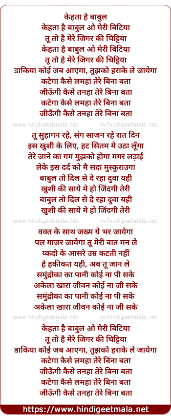 Lyrics of Kehta Hai Babul O Meri Bitiya - कहता है बाबुल ओ मेरी बिटिया