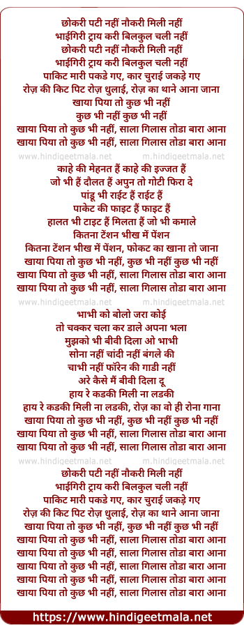 Lyrics of Chokari Patti Nahi Naukari Mili Nahi (Khaya Piya) - छोकरी पटी नहीं नौकरी मिली नहीं