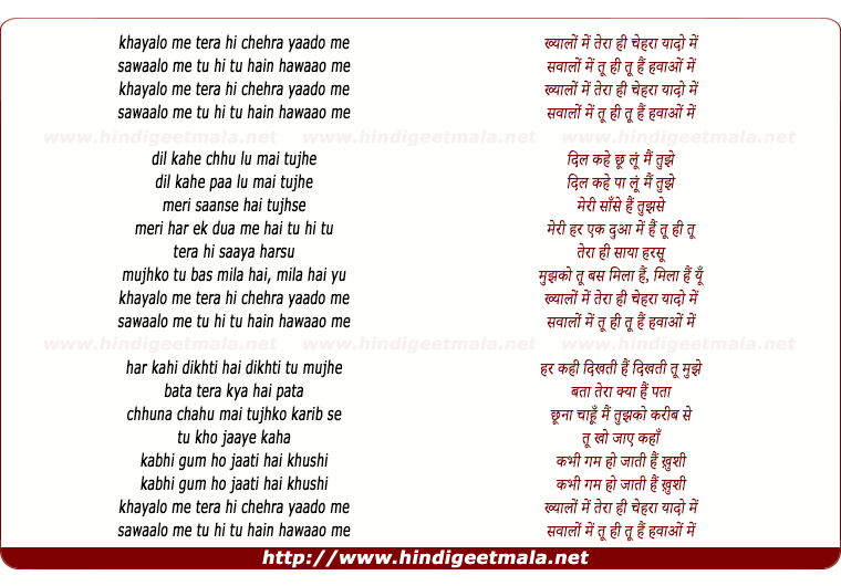 Lyrics of Khayalon Mein - ख्यालों में तेरा ही चेहरा यादो में
