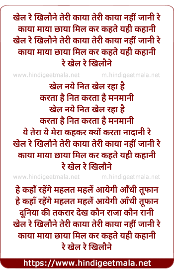 Lyrics of Khel Re Khilone Teri Kaya - खेल रे खिलौने तेरी काया