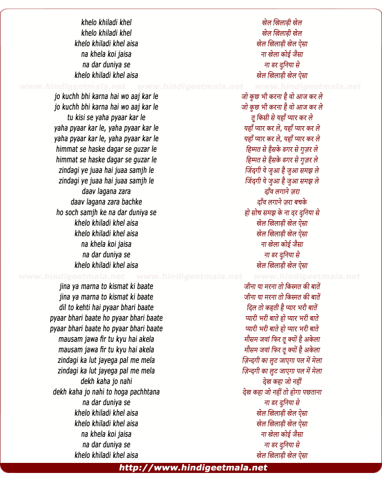 Comments for lyrics of song "Khelo Khiladi Khel Aisa"
