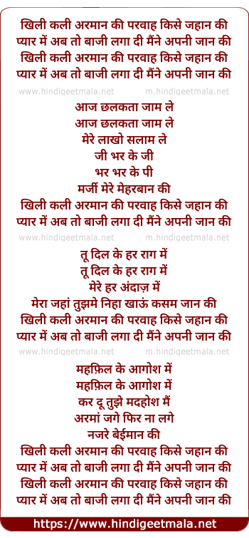 Lyrics of Khili Kali Armaan Ki Parva Kise Jaha - खिली कली अरमान की परवाह किसे जहान