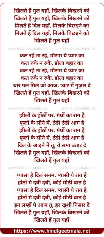 Lyrics of Khilte Hain Gul Yahan, Khilke Bikharne Ko - खिलते हैं गुल यहाँ, खिलके बिखरने को