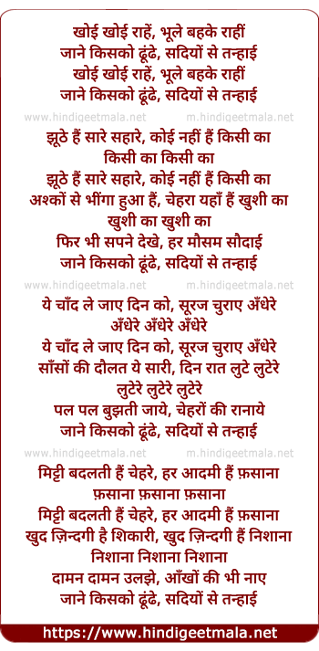 Lyrics of Khoi Khoi Raahe, Bhoole Bahake Raahi - खोई खोई राहें, भूले बहके राहीं