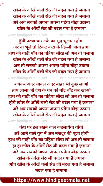 Lyrics of Khol Ke Aankhe Chalo Seth Ji Badal Gaya Hai Jamana - खोल के आँखें चलो सेठ जी बदल गया है ज़माना