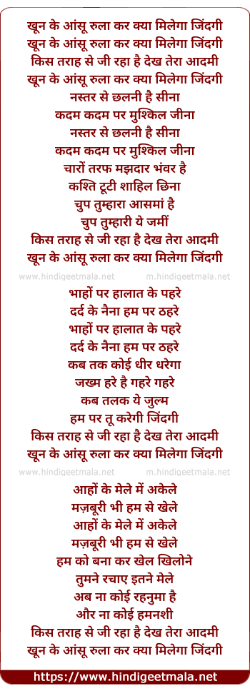 Lyrics of Khoon Ke Aansoo Rula Kar Kya Milega Zindagi - खून के आंसू रुला कर क्या मिलेगा जिंदगी