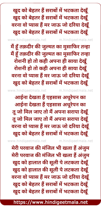 Lyrics of Khud Ko Behtar - खुद को बेहतर हैं सराबों में भटकता देखूँ