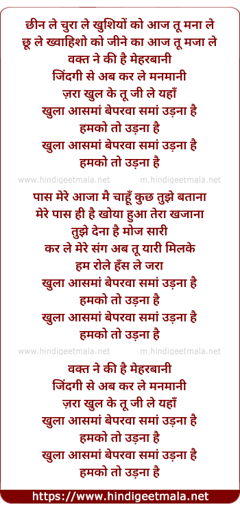 Lyrics of Khula Aasman, Beparwah Sama - खुला आसमां बेपरवा समां