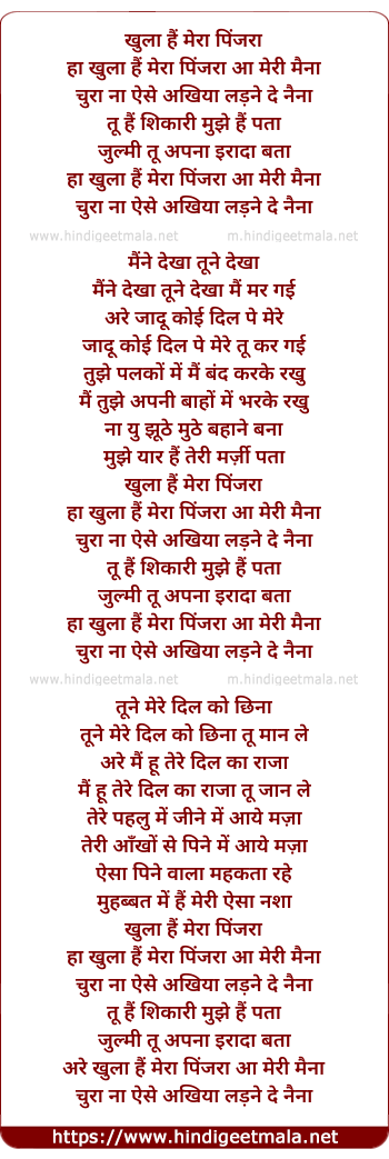 Lyrics of Khula Hai Mera Pinjara, Tu Hai Shikari Mujhe Hai Pata - खुला हैं मेरा पिंजरा, तू हैं शिकारी मुझे हैं पता