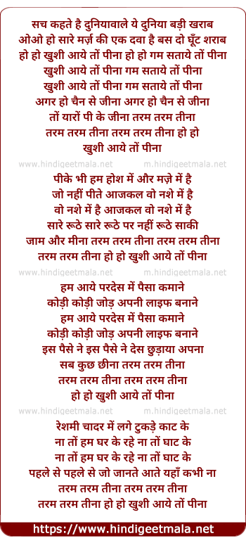 Lyrics of Khushi Aaye To Peena, Gham Sataye To Peena - खुशी आये तों पीना, गम सताये तों पीना