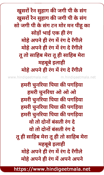 Lyrics of Khusro Raai Suhag Ki Jagi Pi Ke Sang - खुसरों राई सुहाग की जगी पी के संग