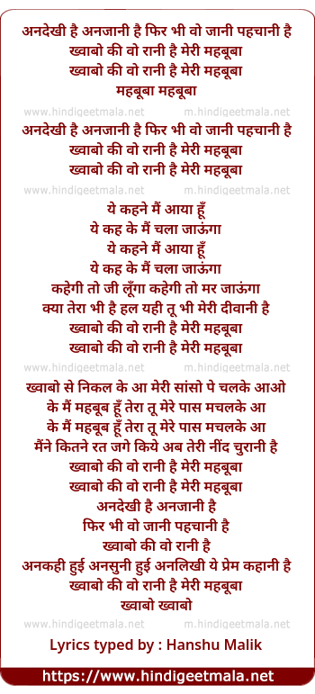 Lyrics of Khwaabon Ki Woh Raani Hai - ख्वाबो की वो रानी हैं
