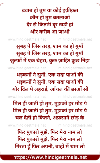 Lyrics of Khwab Ho Tum Ya Koi Haqeeqat, Kaun Ho Tum Batalaao - ख़्वाब हो तुम या कोई हक़ीक़त, कौन हो तुम बतलाओ