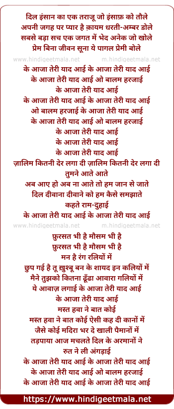 Lyrics of Ke Aaja Teri Yaad Aayi O Baalam - के आजा तेरी याद आई ओ बालमा