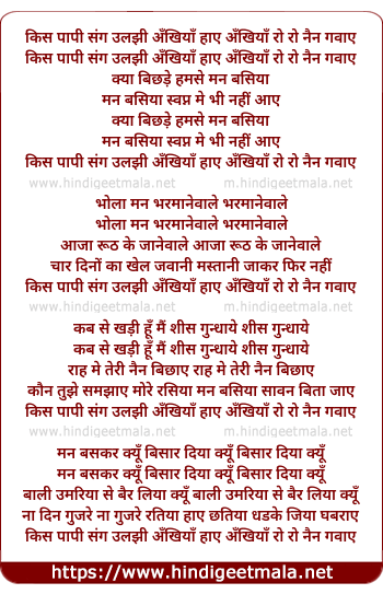 Lyrics of Kis Papi Sang Uljhi Ankhiya Hai Ankhiya - किस पापी संग उलझी अँखियाँ हाए अँखियाँ रो रो नैन गवाए