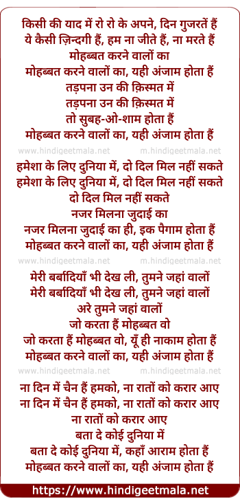 Lyrics of Kisi Ki Yad Mein Ro Ro Ke (Mohabbat Karen Walo Ki, Yahi Anjam Hota Hai) - किसी की याद में रो रो के अपने, दिन गुजरतें हैं