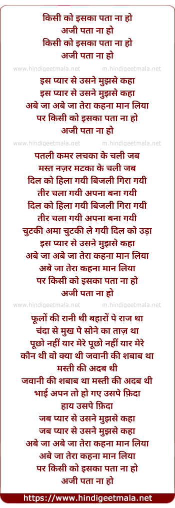 Lyrics of Kisi Ko Iska Pata Na Ho - किसी को इसका पता ना हो