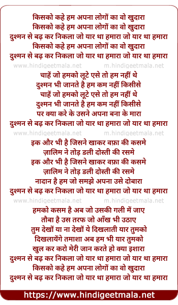 Lyrics of Kisko Kahe Hum Apna Logo Ka Wo Khudaara - किसको कहे हम अपना लोगों का वो खुदारा