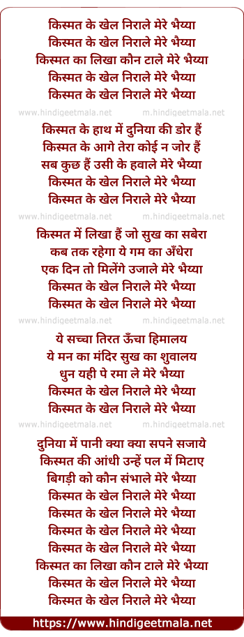 Lyrics of Kismat Ke Khel Nirale Mere Bhaiyya - किस्मत के खेल निराले मेरे भैय्या