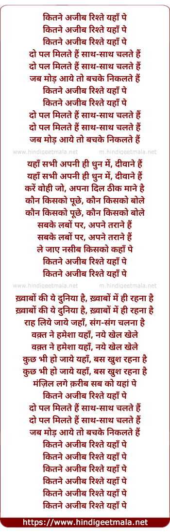 Lyrics of Kitne Ajib Rishte Hai Yaha Pe Do Pal Milte Hai - कितने अजीब रिश्ते है यहाँ पे दो पल मिलते हैं