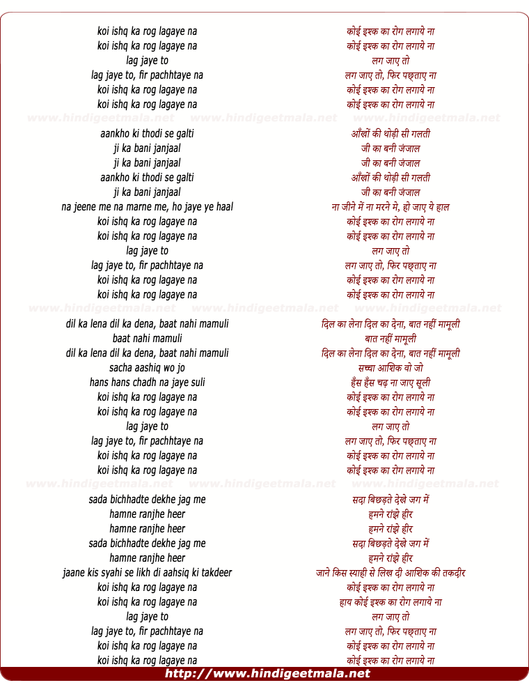 Lyrics of Koi Ishq Ka Rog Lagaye Na - कोई इश्क का रोग लगाये ना
