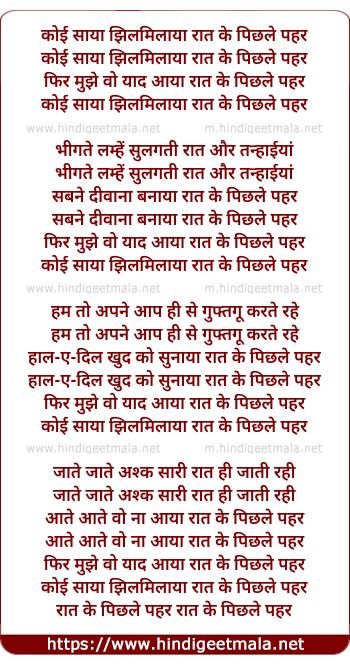 Lyrics of Koi Saaya Jhilmilaaya - कोई साया झिलमिलाया रात के पिछले पहर