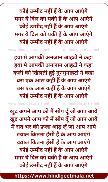 Lyrics of Koi Ummeed Nahi Hai - कोई उम्मीद नहीं हैं के आप आएंगे