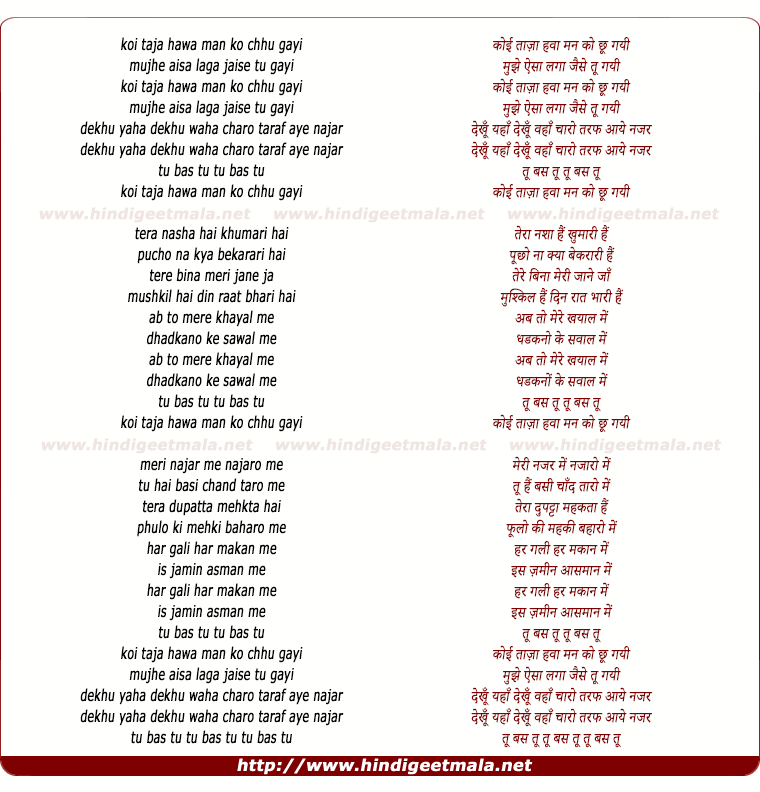 Lyrics of Koyee Taja Hawa Mann Ko Chhu Gayee - कोई ताज़ा हवा मन को छू गयी