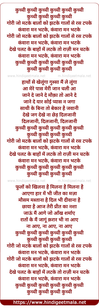 Lyrics of Kuchchi Kuchchi, Gori Jo Matake Baalo Ko Jhatake - कुच्ची कुच्ची, गोरी जो मटके बालों को झटके