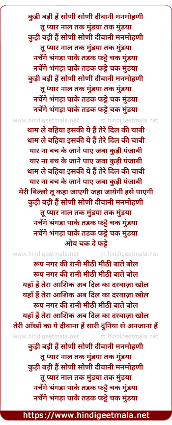Lyrics of Kudi Badi Hai Soni Soni Diwani Manamohani - कुड़ी बड़ी हैं सोणी सोणी दीवानी मनमोहणी