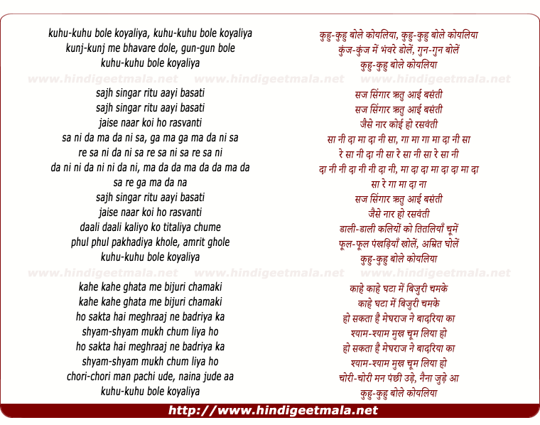 Lyrics of Kuhu Kuhu Bole Koyaliyaa - कुहु-कुहु बोले कोयलिया
