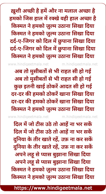 Lyrics of Qisamat Ne Hamako Zulm Uthaanaa Sikhaa Diyaa - किस्मत ने हमको ज़ुल्म उठाना सिखा दिया