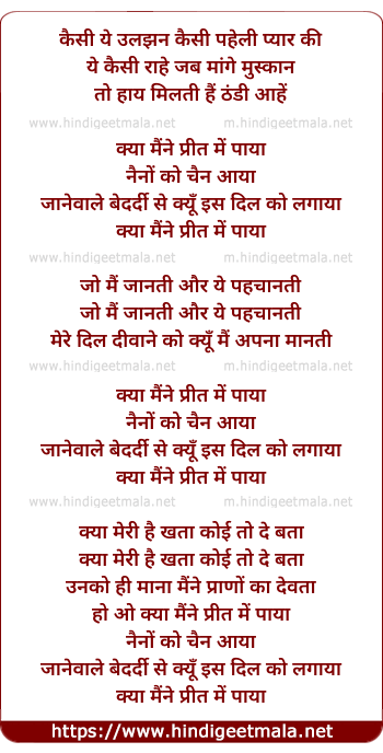 Lyrics of Kya Maine Preet Mein Paya, Naino Ka Chain Ganvaya - क्या मैंने प्रीत में पाया, नैनों को चैन आया