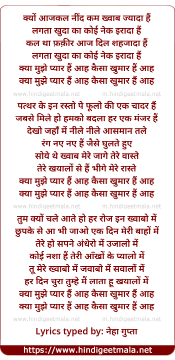 Lyrics of Kya Mujhe Pyar Hai Aah Kaisa Khumaar Hai - क्या मुझे प्यार हैं आह कैसा खुमार हैं