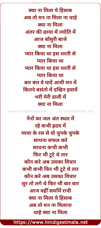 Lyrics of Kya Naa Mila - क्या ना मिला ये हिसाब