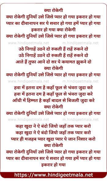 Lyrics of Kya Rokegi Duniya Use Jise Pyar Ho Gaya - क्या रोकेगी दुनिया उसे जिसे प्यार हो गया