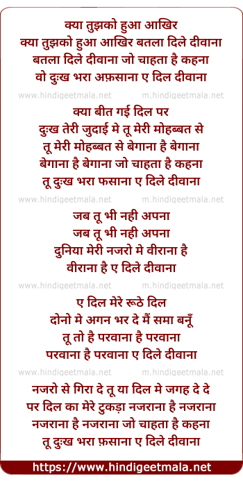 Lyrics of Kya Tujhko Hua Aakhir Batla Dile Diwana - क्या तुझको हुआ आखिर बतला दिले दीवाना