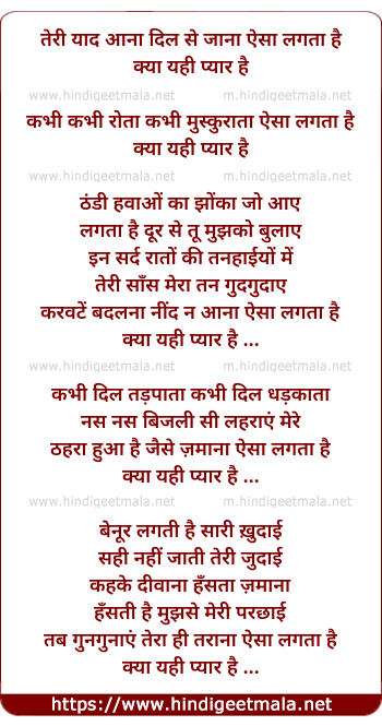 Lyrics of Kya Yahi Pyar Hai - तेरी याद आना दिल से जाना ऐसा लगता है