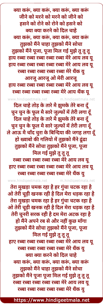 Lyrics of Kyaa Karun, Rabbaa Mere I Love You - क्या करूं, रब्बा मेरे आई लव यू