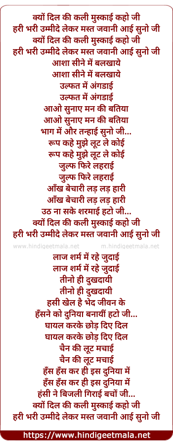 Lyrics of Kyo Dil Ki Kali Muskayi - क्यों दिल की कली मुस्काई कहो जी