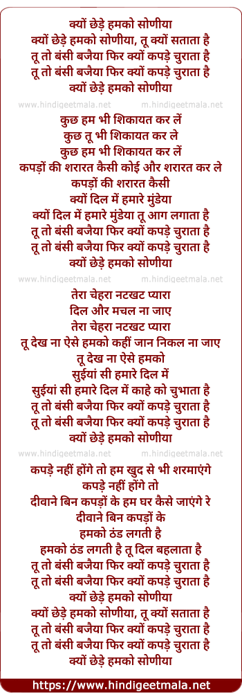 Lyrics of Kyu Chhede Humko Soniya - क्यों छेड़े हमको सोणीया