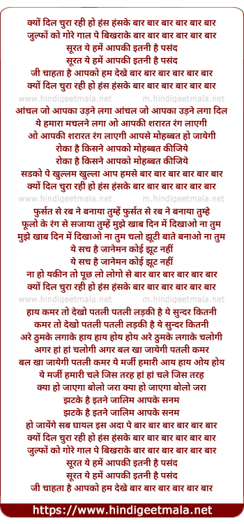 Lyrics of Kyun Dil Chura Rahi Ho Has Haske Baar Baar - क्यों दिल चुरा रही हो हंस हंसके बार बार बार बार बार बार