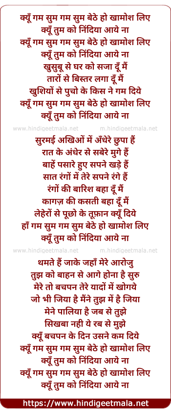 Lyrics of Kyun Gum Sum - क्यूँ गम सुम गम सुम बेठे हो खामोश लिए
