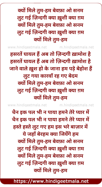 Lyrics of Kyun Mile Tum Hum, Bewafa O Sanam - क्यों मिले तुम-हम बेवफ़ा ओ सनम