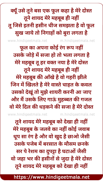 Lyrics of Kyun Use Tune - क्यूँ उसे तूने बस एक फूल कहा है मेरे दोस्त