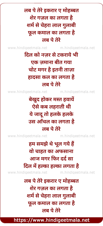 Lyrics of Lab Pe Tere Iqaraar-E-Mohabbat Sher Gazal Ka Lagataa Hai - लब पे तेरे इकरार ए मोहब्बत