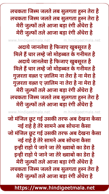 Lyrics of Lachakta Jism Jalte Lab Sulagta Husn Tera Hai - लचकता जिस्म जलते लब सुलगता हुस्न तेरा है