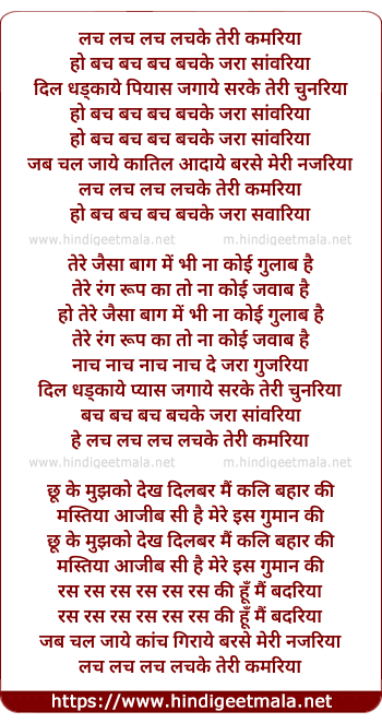 Lyrics of Lachke Teri Kamariya - लचके तेरी कमरिया